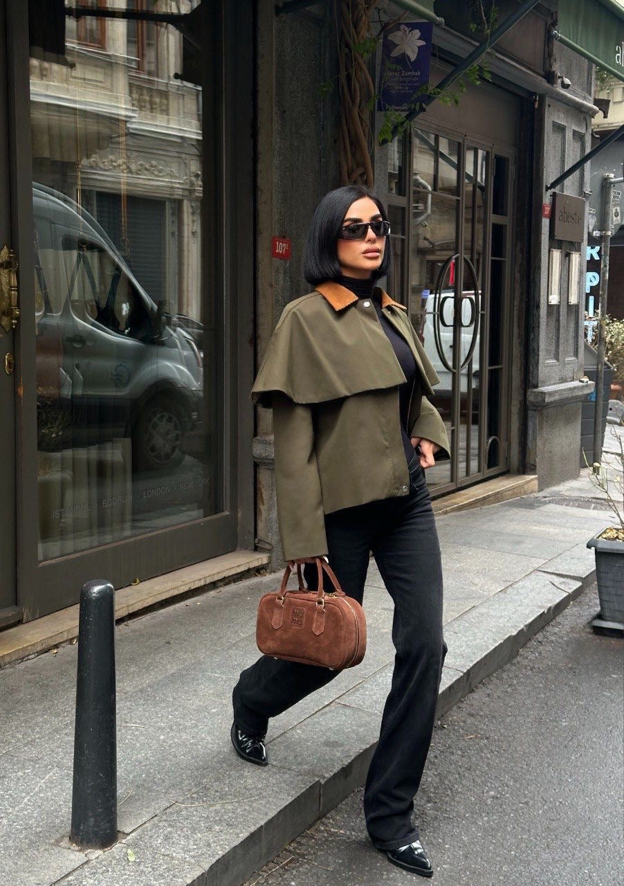 Adoptez une allure chic et sophistiquée avec cette jacket cape femme, conçue dans une teinte kaki élégante et sublimée par un col contrasté camel. Sa coupe cape structurée offre un tombé raffiné, tout en garantissant confort et liberté de mouvement.