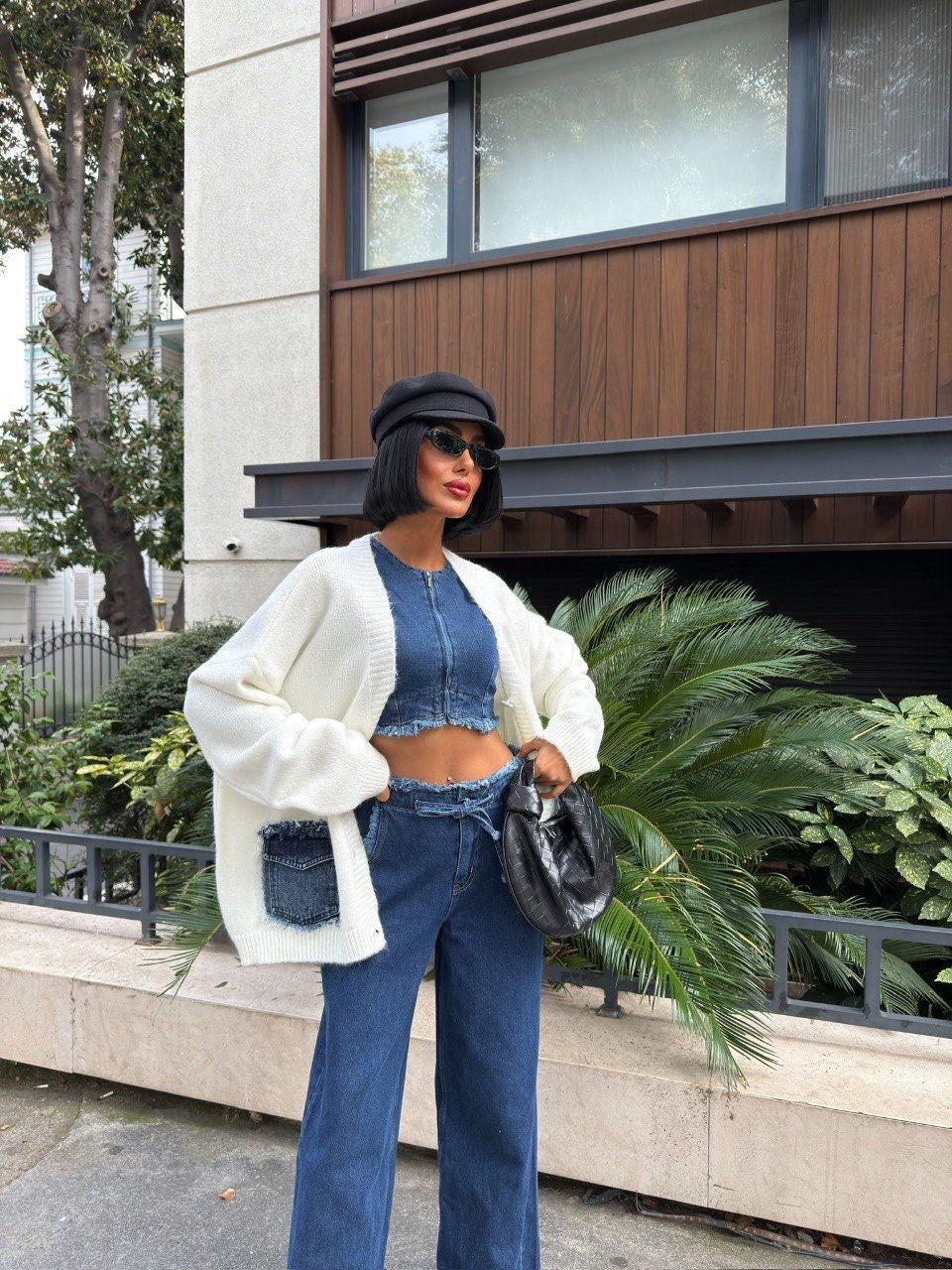 Cardigan blanc femme avec poches en jean – Style oversize tendance